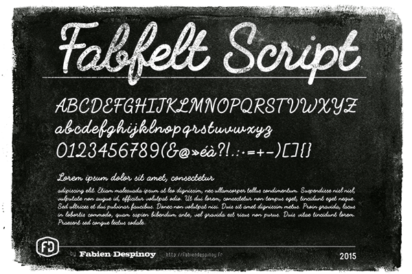Fabfelt Script is a handwrite typeface made with strong lines as the author’s image illustrate it’s ideal for a retro look, check out this cool type : )